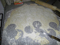 Quando estiver com uma boa espessura ( não pode estar muito fino ,pois fica frágil e facilmente pode rasgar, mas também não as quer muito grossas pois a consistência será muito pesada) com a massa esticada pegue num copo e marque círculos na massa de maneira a aproveitar bem o espaço e separe-os para poder colocar o recheio no centro.